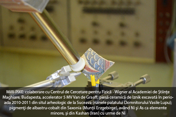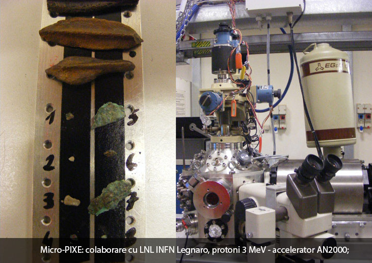 • PIXE – (Proton Induced X-ray Emission) - Emisie de raze X Indusă de Protoni de 3 MeV; prin colaborări internaţionale: micro-PIXE şi micro-SR-XRF (Synchrotron Radiation - X-Ray Fluorescence); elemente analizate: de la magneziu la uraniu; cantitate minimă detectată: 5-10 ppm (părţi per milion); suprafaţă analizată scanată: până la 25x25 mm pentru determinarea microstructurii prin hărţi elementale; adâncime analizată: 30-60 microni, în funcţie de material