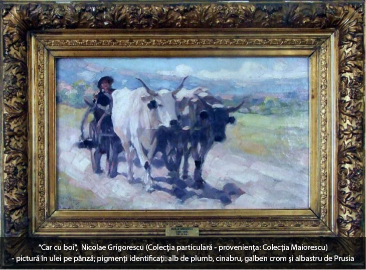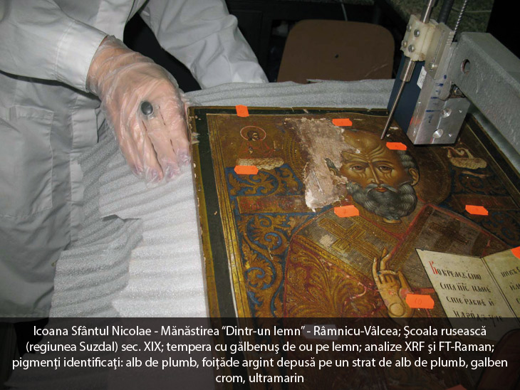 - identificarea materialelor picturale utilizând baze de date spectrale FTIR şi FT-Raman. (Spectroscopia de infraroşu furnizează informaţii despre componenta organică a stratului pictural, iar spectroscopia Raman este o metodă de analiză nedistructivă fără contact folosită mai mult pentru studiul pigmenţilor)
